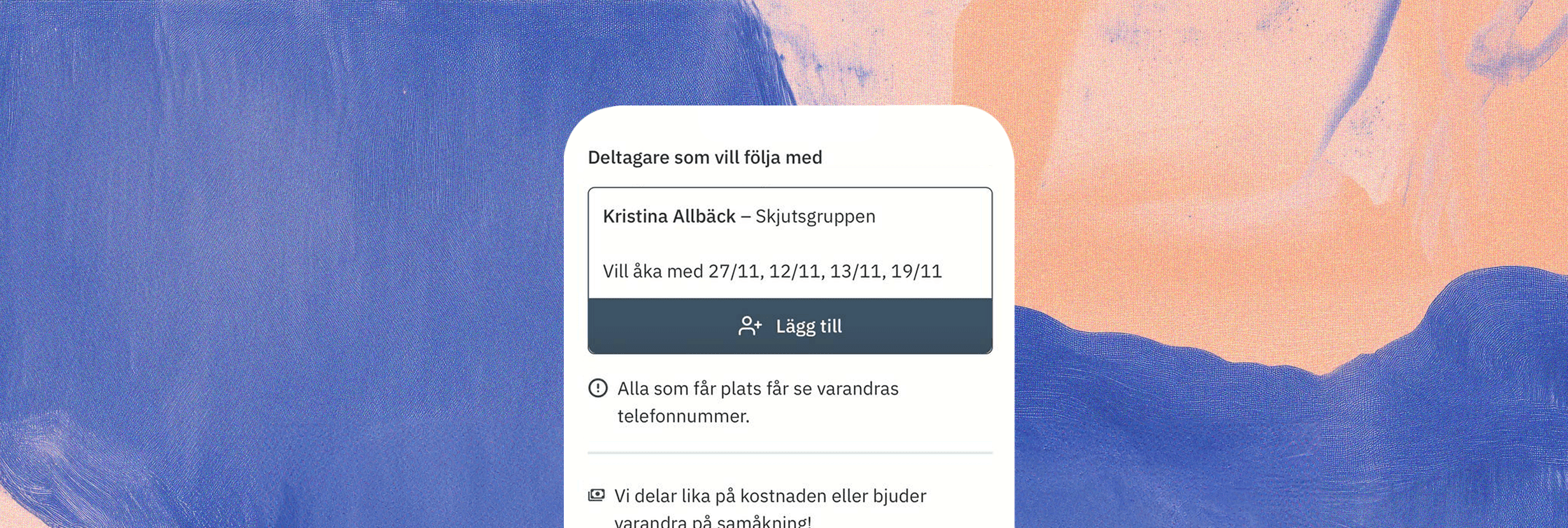 När någon vill åka med så får du ett SMS. Du ser vilka datum personen vill åka med och godkänner den genom att trycka på "Lägg till". Personen får då ett SMS om att den är godkänd. Efter detta ser ni varandras telefonnummer.