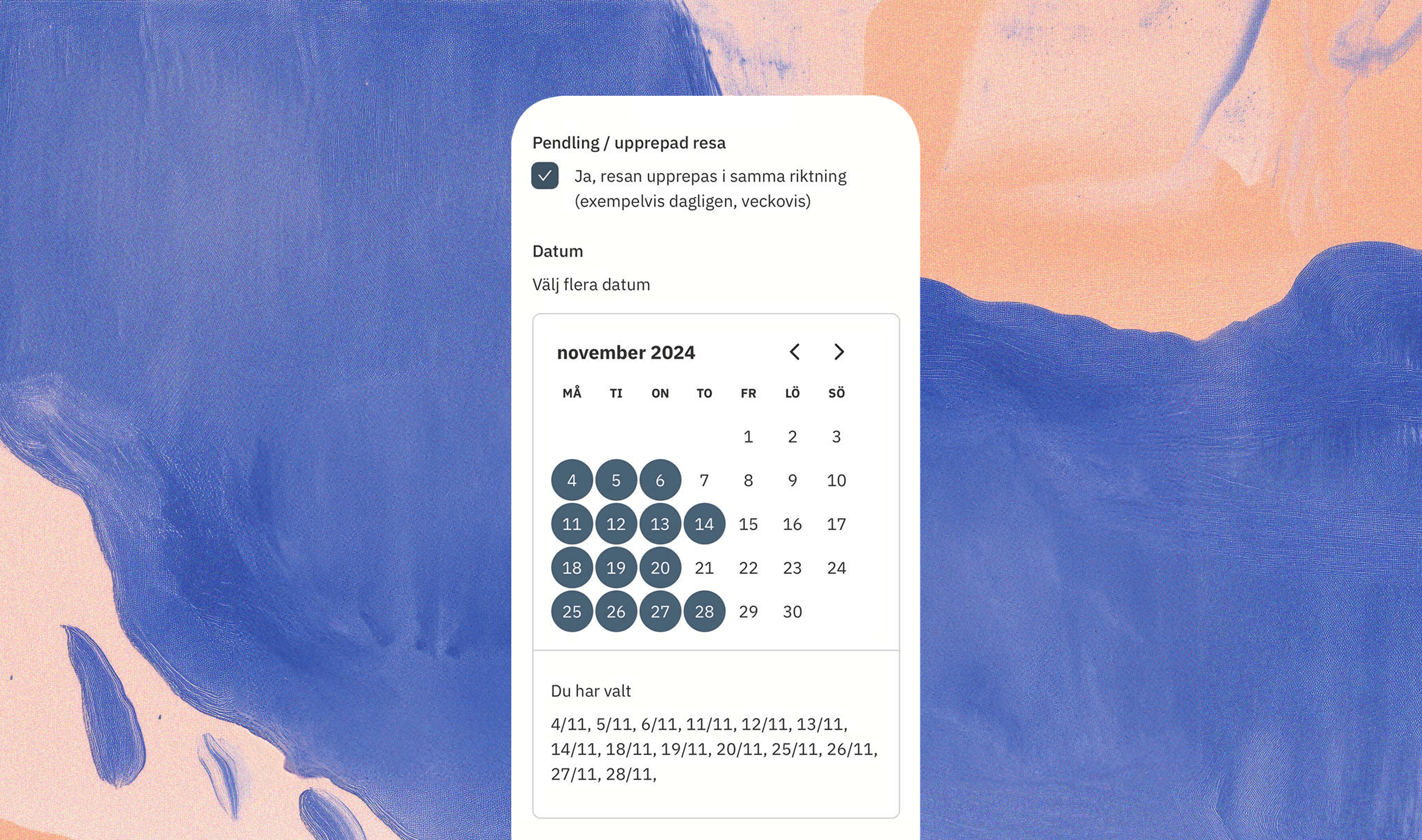 Här väljer du alla datum som andra kan åka med dig. Välj flera datum. Under kalendern ser du vilka datum du har valt.