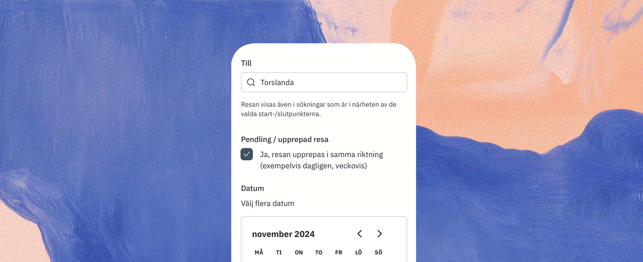 Fyll i "Från" och "Till" och klicka i boxen för pendling / upprepad resa. Här ser du att detta gäller resor som går i samma riktning vid olika datum. För resor i andra riktningen gör du ett nytt inlägg efter du är klar.