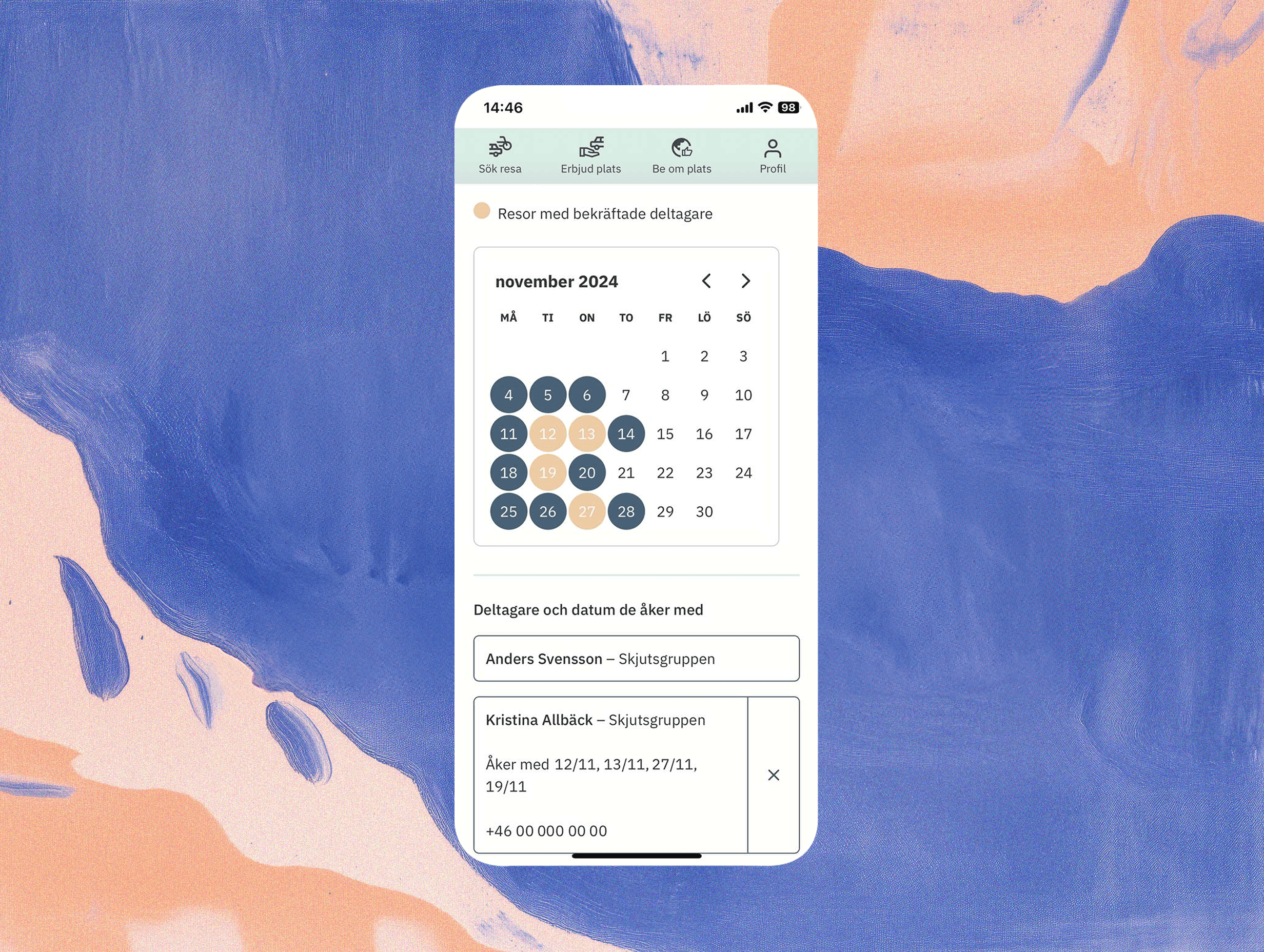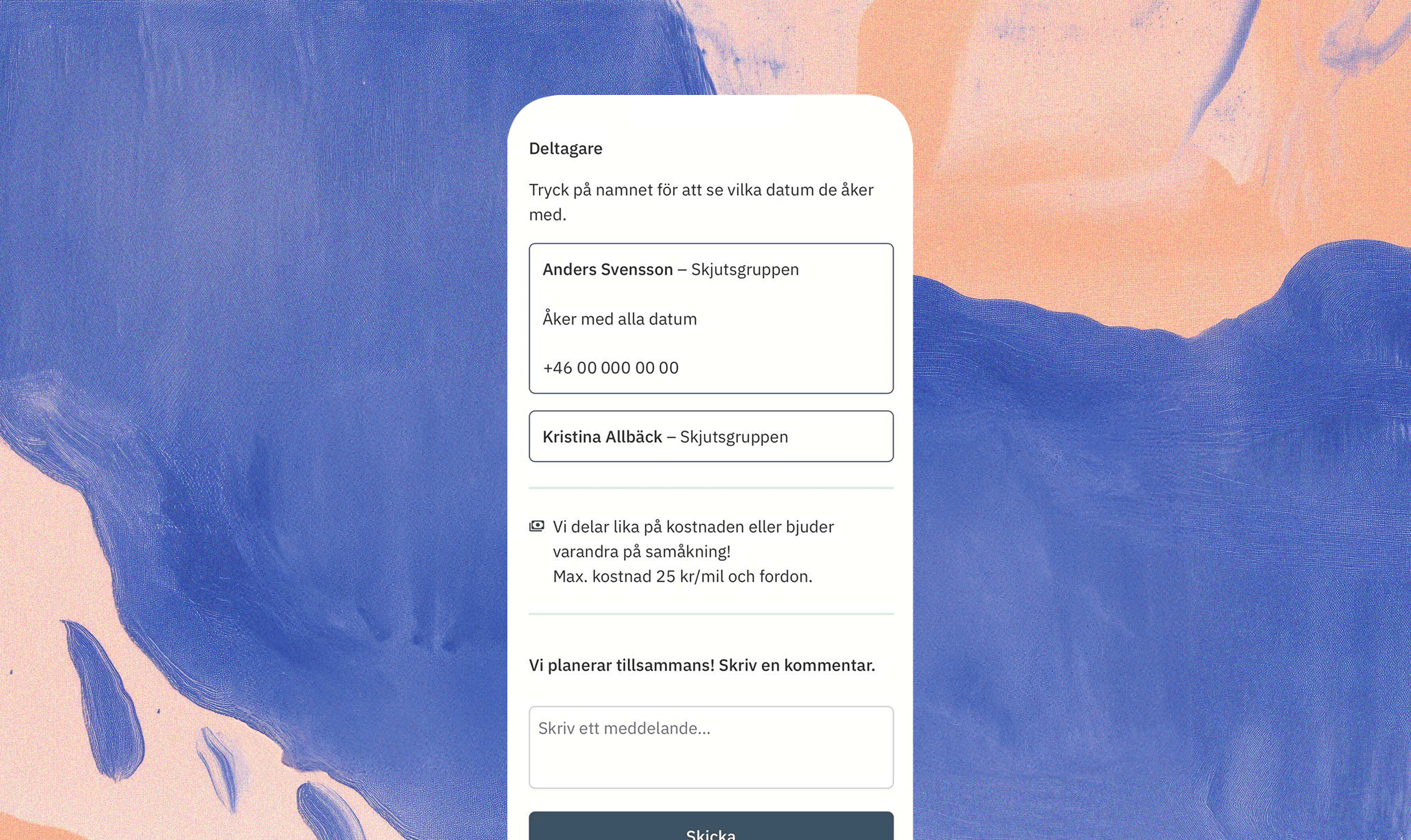 Nu när du är godkänd så ser du övriga deltagare och vilka telefonnummer de har. Nu kan ni ringa eller SMSa varandra. Ni kan också chatta med varandra direkt i resan. Trevlig pendling!