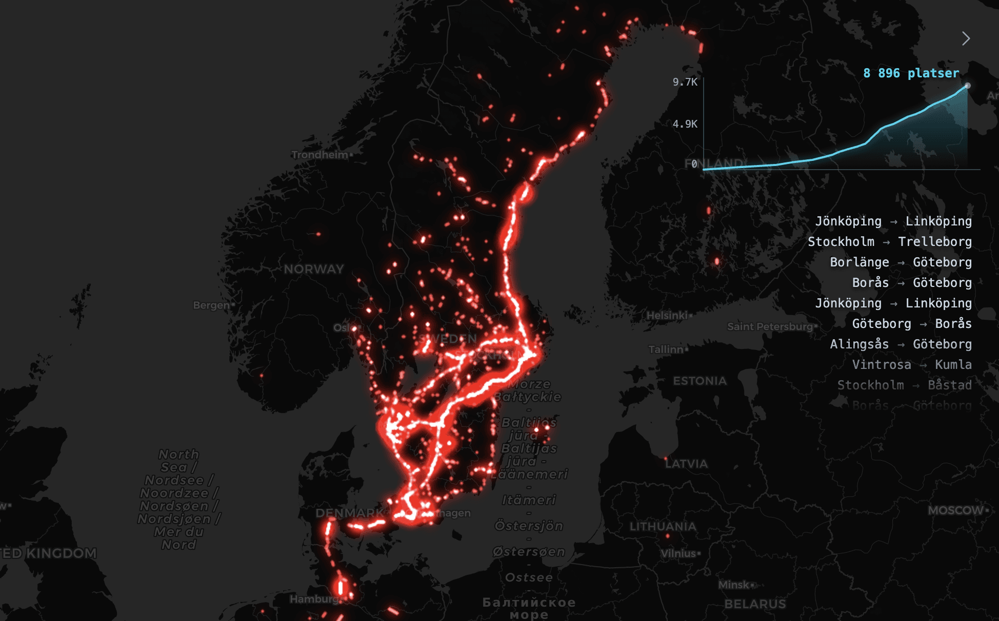 Resorna är ackumulerade. Det innebär att totalen växer: tidigare resor ligger kvar i animeringen samtidigt som grafen över lediga platser ökar.